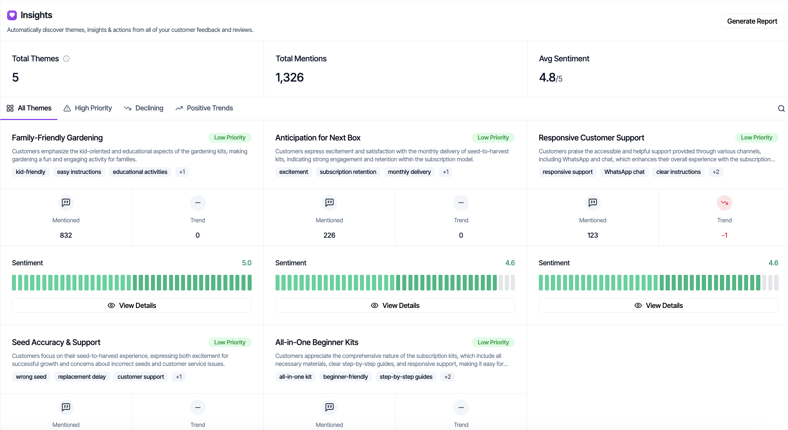 When sentiment starts declining for a theme, you get early warning. Fix issues when they are small problems, not after they have cost you customers and damaged your reputation.
