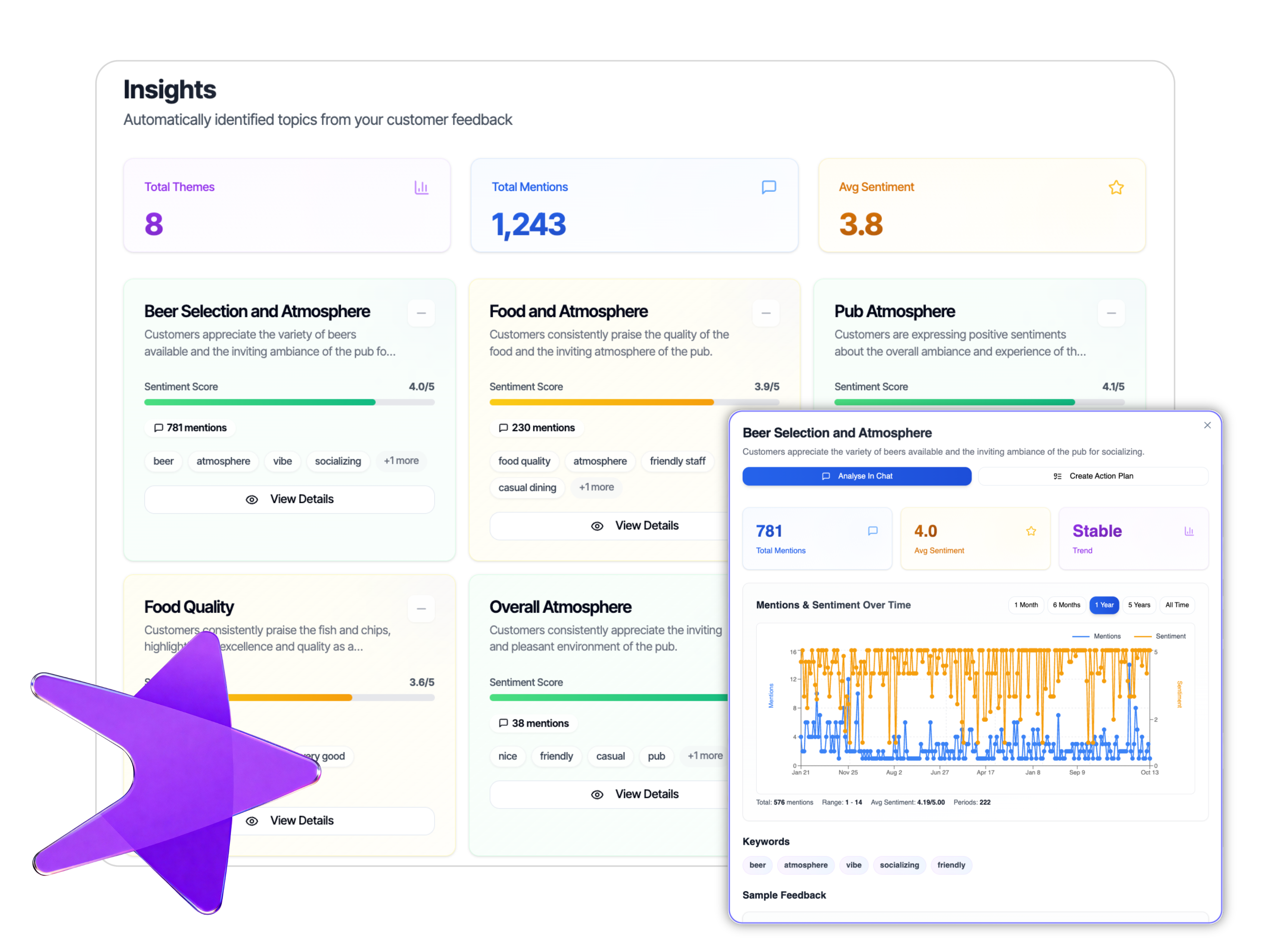 When sentiment starts declining for a theme, you get early warning. Fix issues when they're small problems, not after they've cost you customers and damaged your reputation.